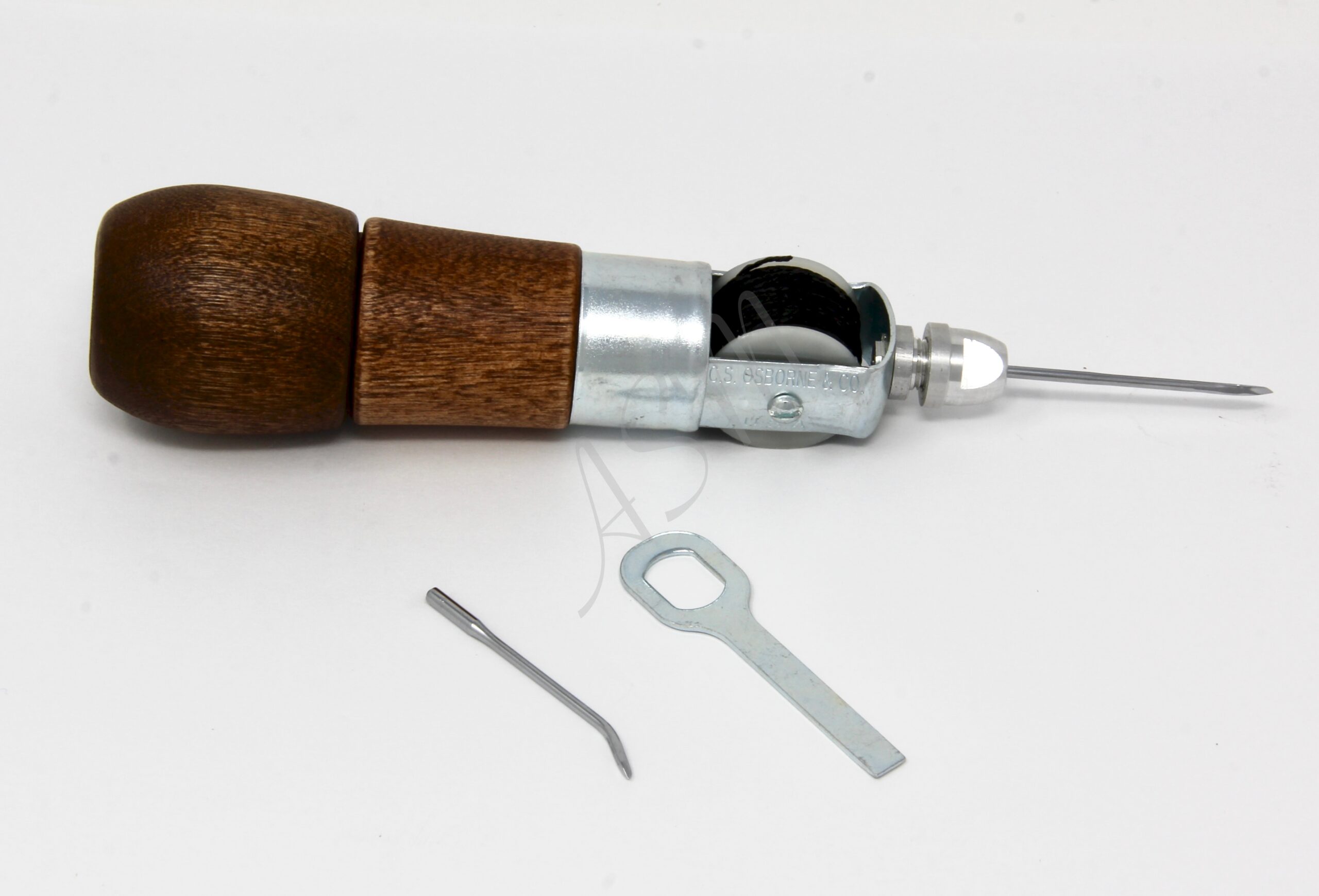 C.S. Osborne No. 413 Automatic Awl An usual tool for sewing leather, canvas and similar materials. The awl carries a spool of waxed polyester black thread on the handle. Hollow handle holds an extra curved needle and wrench. Directions furnished with each awl explain how the automatic awl lock stitch can be used in repair work. Furnished with one straight (No. 413N 8) and one curved diamond point (No. 413N 6) needle.