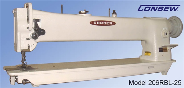 Consew 206RBL 25″ is a single needle long arm walking foot machine with 25″ of work space under the arm of the machine, allowing for long, large or difficult to sew material to pass under the machine. Compared to the 10″ workspace of the regular Consew 206RB machines, this extra workspace will come in handy for sewers who need to sew large items. Single needle triple feed: drop feed, needle feed and alternating (walking) presser feet lockstitch machine with centralized arm lubrication reservoir-oiled hook with micrometric control valve large horizontal axis rotary hook and bobbin (side loaded) adjustable reverse feed locking stitch regulator safety clutch factory built solid molded casting