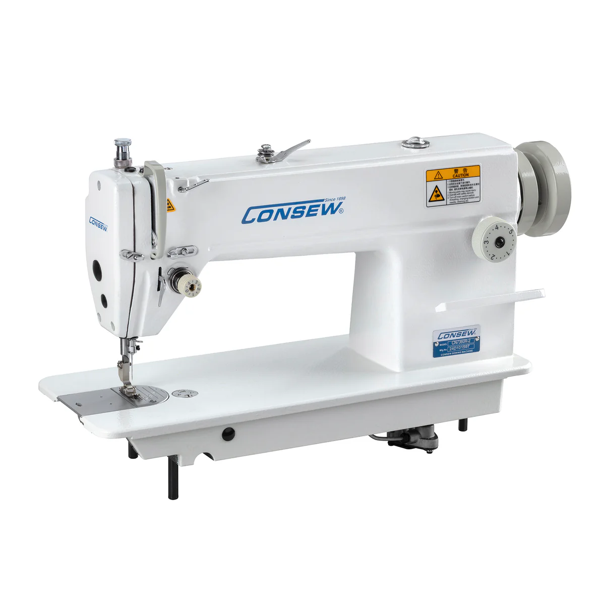 Consew 7360R is a high speed single needle drop feed sewing machine for garments and tailor type work. Fully automatic lubrication with recirculation pump feeds oil from the oil pan through out the machine. Reverse feed, bottom loading bobbin, and interchangeable feed, feed dog and needle plate accept hundreds of accessories for specific sewing needs.